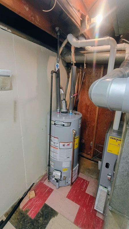 Replaced existing water heater with new 40-gallon Bradford White draft vent model. Installed new 1/4 turn ball valve to replace old valve, ensuring proper connection to existing plumbing. Completed installation in residential utility area with all connections secured and system functioning properly.