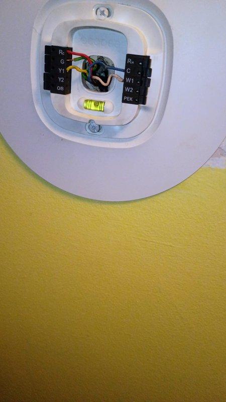 Performed planned maintenance on heat pump system that was experiencing inconsistent operation. Upon arrival, inspected the thermostat installation, which required removing the unit from its mounting plate to access terminal connections. Verified proper wiring configuration at the thermostat control board (Rc, G, Y1, Y2, OB terminals) and confirmed all connections were secure. System testing after service confirmed proper heat pump cycling and temperature control restoration.