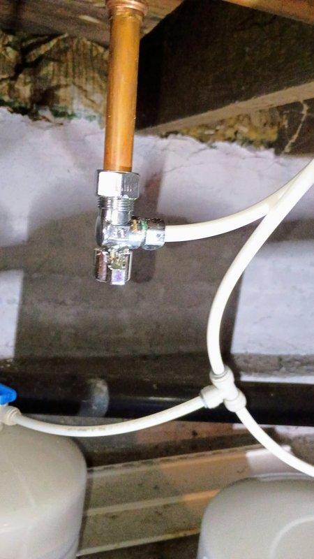 Responded to water leak service call for reverse osmosis system. Inspected the connection point between copper supply pipe and valve fitting where white flexible tubing branches off. Located and repaired leak at the valve connection by tightening fitting and replacing damaged section of tubing to restore proper system function.