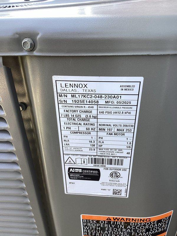 Completed planned maintenance on Lennox mini-split air conditioning system, model ML17KC2-048-230A01. Performed comprehensive system inspection, replaced air filter, and documented unit specifications and operational status with photography for service records.
