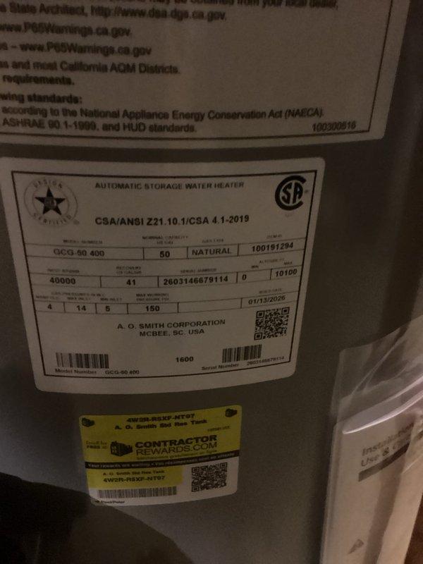 Provided remote estimate for installation of 50-gallon natural gas water heater. Reviewed existing A.O. Smith 60-gallon automatic storage water heater specifications via submitted photos, confirming model GCG 60 400 with CSA certification. Quoted replacement with appropriately sized unit based on current system configuration and venting requirements.