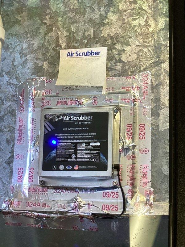Installed Air Scrubber by ActivePure indoor air quality system on existing HVAC ductwork. Unit was mounted to metallic ductwork, powered up, and verified operational with blue LED indicator illuminated, enhancing the home's air purification capabilities.