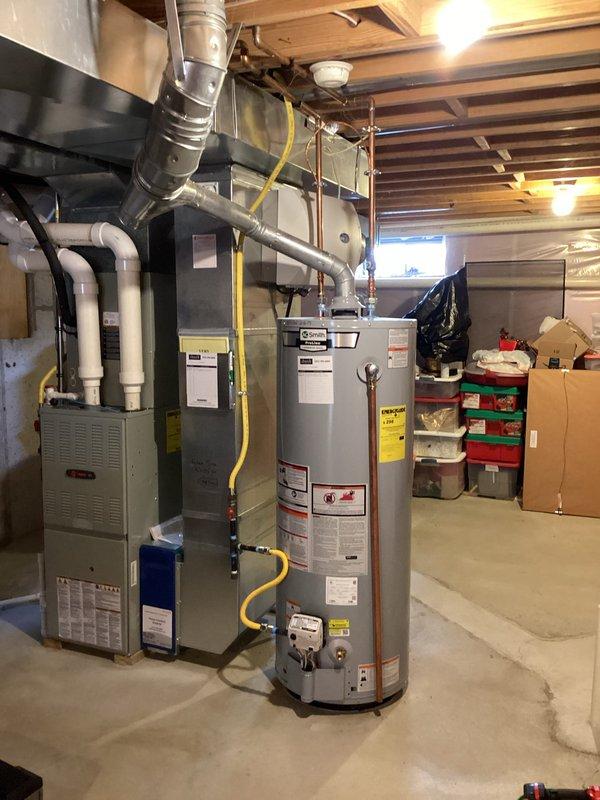 Completed full HVAC system installation featuring a Lennox ML196 high-efficiency gas furnace and ML13 air conditioning unit in basement utility area. Reused existing thermostat, filter rack, and condensate pump while re-routing the pump's discharge hose to the washing machine standpipe for proper drainage. Installed new 1-inch air filters and reconnected ductwork boot serving the nearby bathroom that had become detached. All ductwork connections were secured, electrical wiring was properly terminated, and system was tested for proper operation. Installation met manufacturer specifications and local code requirements.