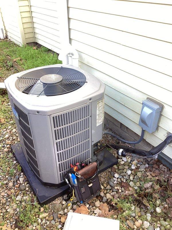 Completed planned air conditioning maintenance on outdoor condensing unit. Performed standard inspection of compressor, condenser coil, fan motor, and electrical connections. Verified proper operation of disconnect box and all system components operating within normal parameters.