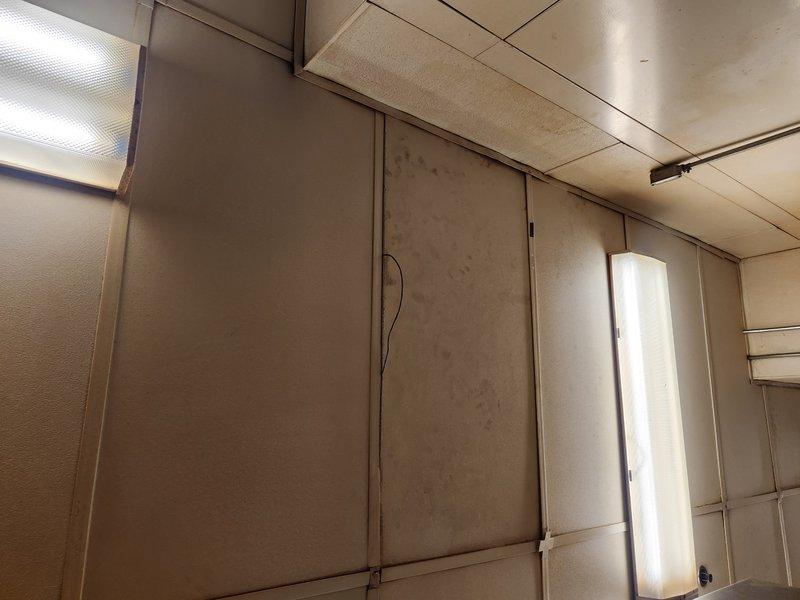 Responded to water leak complaint originating from commercial deli cooler unit. Upon arrival, conducted visual inspection of affected area including wall panels, ceiling tiles, and adjacent infrastructure. Documented existing conditions through photographic evidence showing interior commercial space with beige wall paneling, acoustic ceiling tiles, and overhead fluorescent lighting fixtures. Identified potential moisture intrusion points and assessed structural components for water damage indicators including discoloration and wear patterns on wall surfaces. Inspected vertical piping and conduit systems running along wall for signs of active leakage or compromised connections.