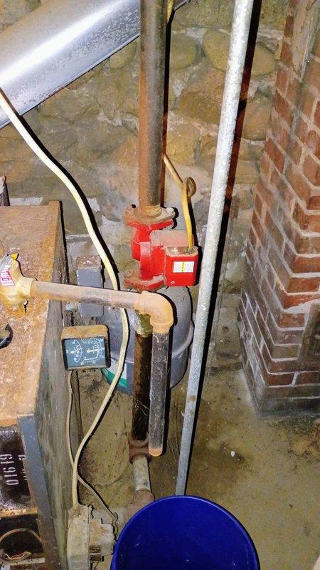 Responded to no heat call for 40-year-old boiler system with zero PSI. Diagnosed failed circulator pump preventing water circulation through the heating system. Replaced red circulator pump on copper pipe network and restored proper pressure to the system. System now functioning normally with appropriate water flow.