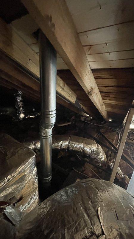 Installed 4" B-Vent system for water heater, ensuring proper height, plumb positioning, and code-compliant storm collar caulking. Repaired damaged ductwork in attic, replacing sections of insulated flexible ducting and securing all connections to restore proper system functionality.
